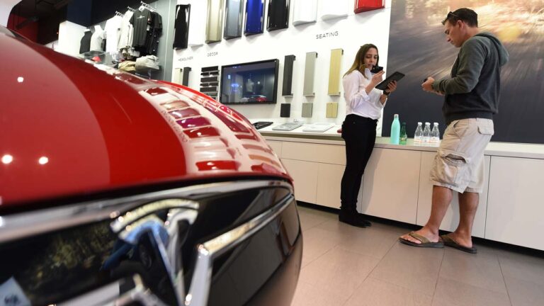 (File) This file photo taken on March 31, 2016 shows a sales representative assisting a customer in pre-ordering the yet-to-be-released Tesla Model 3 at the Tesla Store in Santa Monica, California. Tesla’s first low-cost Model 3 will roll off the assembly line two weeks early, on July 7, 2017, CEO Elon Musk announced on July 3. Robin Beck/AFP