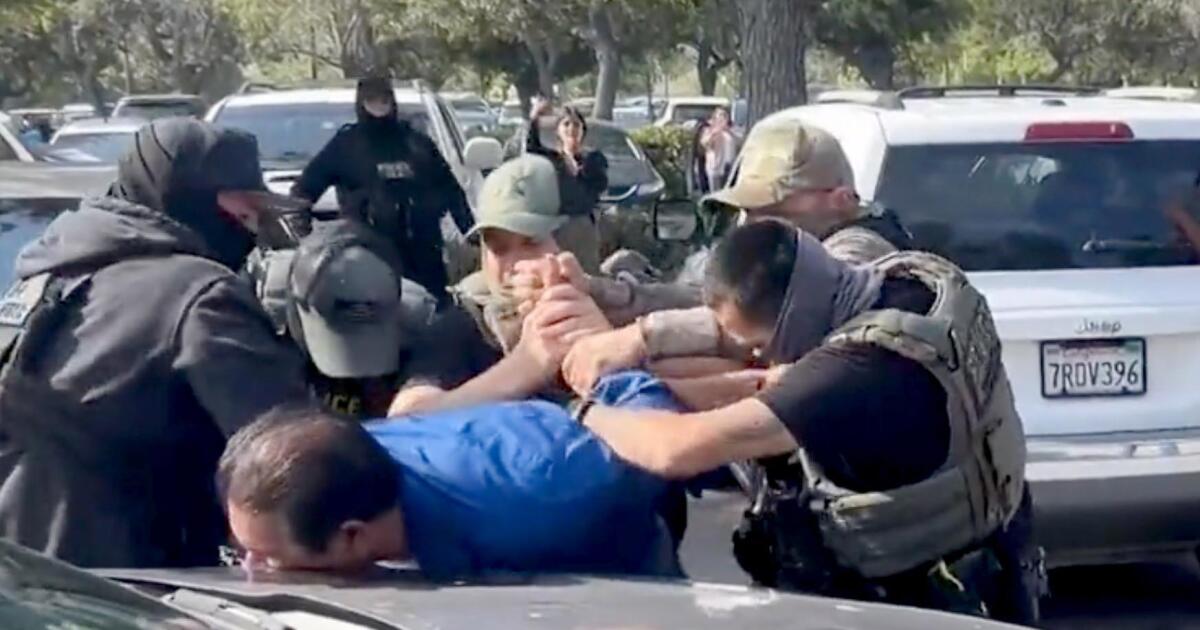 Witnesses reported that federal immigration agents were present in the Rancho Cucamonga courthouse parking lot around 9 a.m., initiating arrests of individuals exiting the courthouse until approximately noon. Eyewitnesses recounted an incident at 9:30 a.m. when a man and his son were encircled by officers in the parking lot, where masked agents restrained the man and placed him in the back of an SUV.